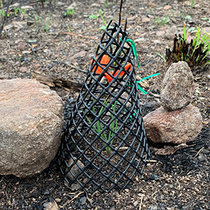 Searching for ways to reduce the animal mayhem, I began experimenting with various temporary shelters like the plastic mesh cone shown below. Curiously enough, the period of intense predation for longleaf seedlings only seems to last a few weeks, perhaps demarcated by the appearance of secondary needles. The presence of a shelter during this brief period significantly reduced losses to BRBs (although I did occasionally find evidence that deer had made sport of the shelters themselves!). Further, the removal of the shelter a couple of months later does not seem to produce the same uptick in predation that accompanies planting.
