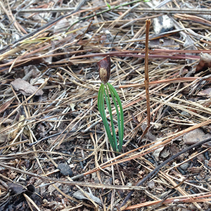 In my experience, a seed carefully planted straight into the forest floor will germinate at close to the rate one gets in containers. In fact, natural regeneration of several iconic western conifers, including sugar, ponderosa and whitebark pine, depends heavily on “scatter hording” behavior in birds and rodents whereby seeds are buried in caches in the fall but forgotten by spring. For species dependent on scatter hording, I suspect that seeds will do best if buried perhaps a centimeter below the surface. For longleaf, however, I have achieved the best results inserting the ground with the radical end pointing down (meaning wing end up) so that most of the seed is below the surface, like the picture below on the left shows.