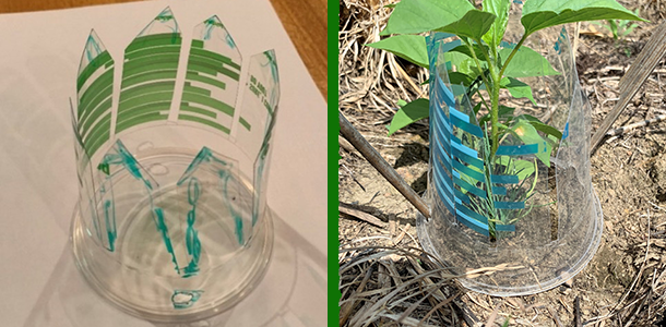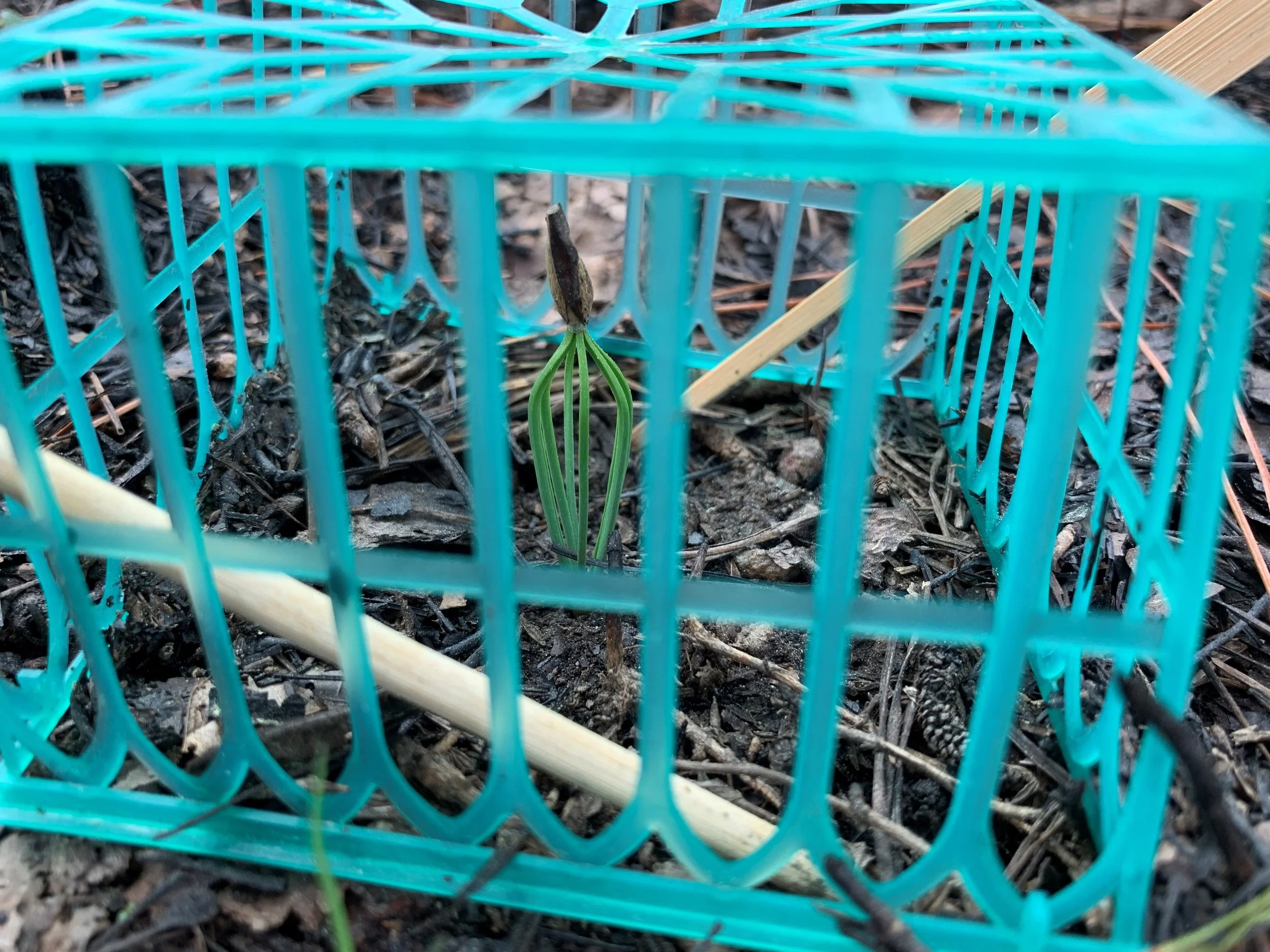 Puzzling over this problem, my first “a-ha moment” was to picture cutting the bottom out of a drink cup made of cornstarch plastic in a pattern that leaves protruding spikes or palisades. Turned upside down, the mostly solid plastic side seems to thwart or at least deters small mammals, birds and ground-crawling insects and, provided the length of the palisades are roughly equal to the diameter of the bottom opening, the palisade points seem to deter larger animals like deer and rabbit. At the same time, the open top allows other vegetation to grow alongside the desired seedling without fouling the shelter, and the risks associated with leaving a shelter made of cornstarch plastic in the woods seemed at least slightly less troubling than might be the case with petroleum-based plastics.