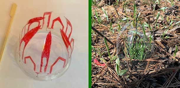 The process of trying to perfect methods of bending the palisade using various kitchen appliances led to a third idea, which is that the ideal shelter material for some applications would be biodegradable or at least pyro-degradable in the sense of being consumed by prescribed fire, the essential forest management tool for longleaf pine. As one might imagine, I spent a fairly absurd amount of time working with scissors to cut up compostable plastic cups before I had a design that seemed to work in the field. That design is now patented and the name Seed Crown is registered as a trademark, all in anticipation of making the shelters available to the public.
