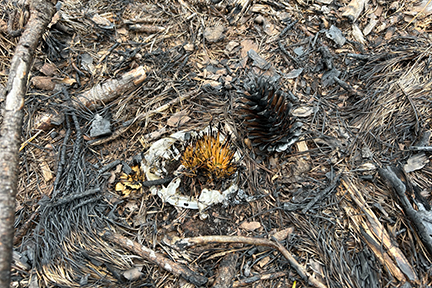 To date, the prototypes have been exposed to low intensity fires conducted at 14 months and about two years. As the photos below show, while the seedlings appear just fine even at 14 months, the degree to which the shelter material burned or melted was highly variable and few locations saw the material completely consumed. As noted earlier, efforts are underway to develop a single-use model made from coated or lined paper stock that should be more readily consumed by fire. Also, burning at three years may mean that the longleaf seedling’s needles will contribute meaningful fuel that would probably help regardless of the Seed Crown® material.